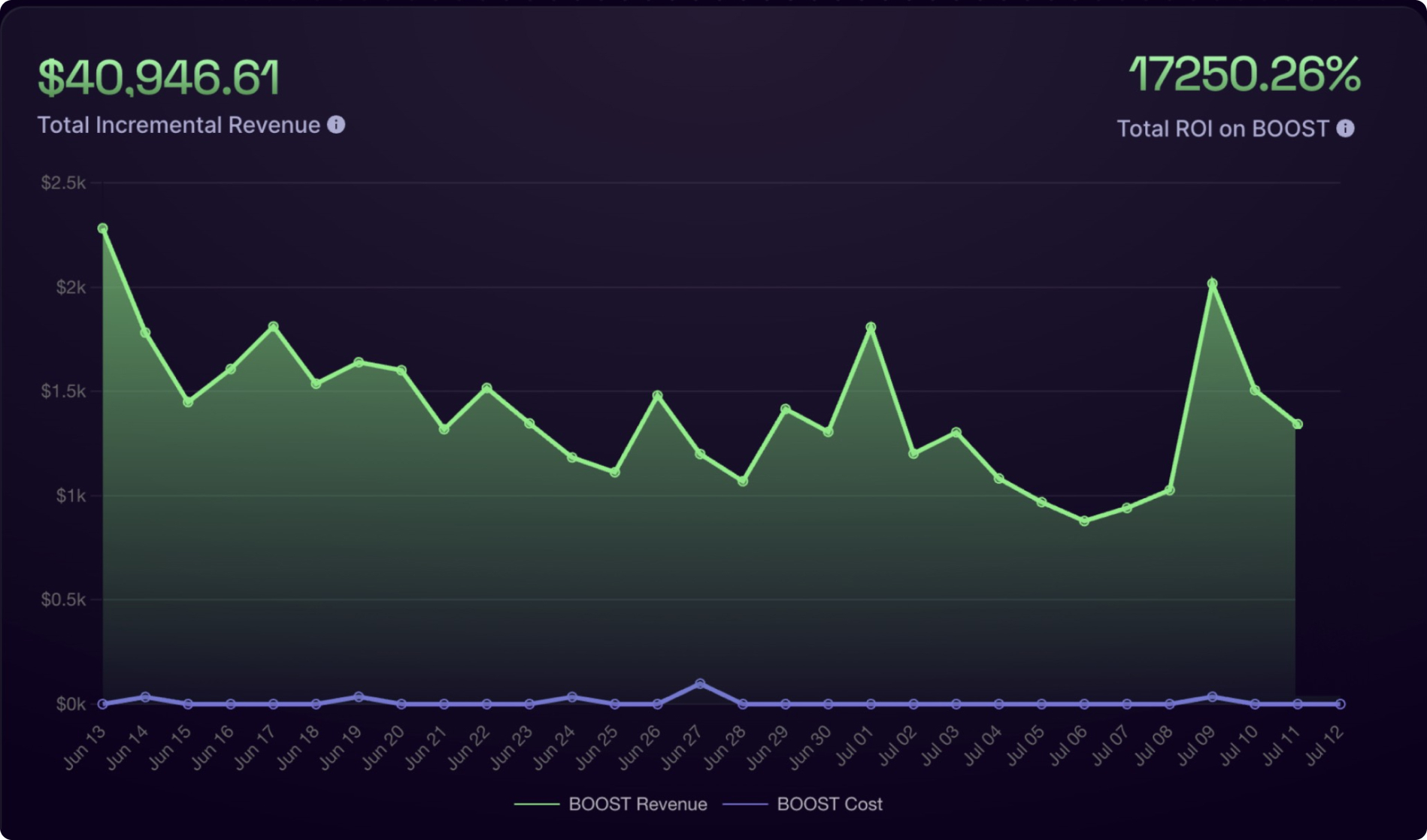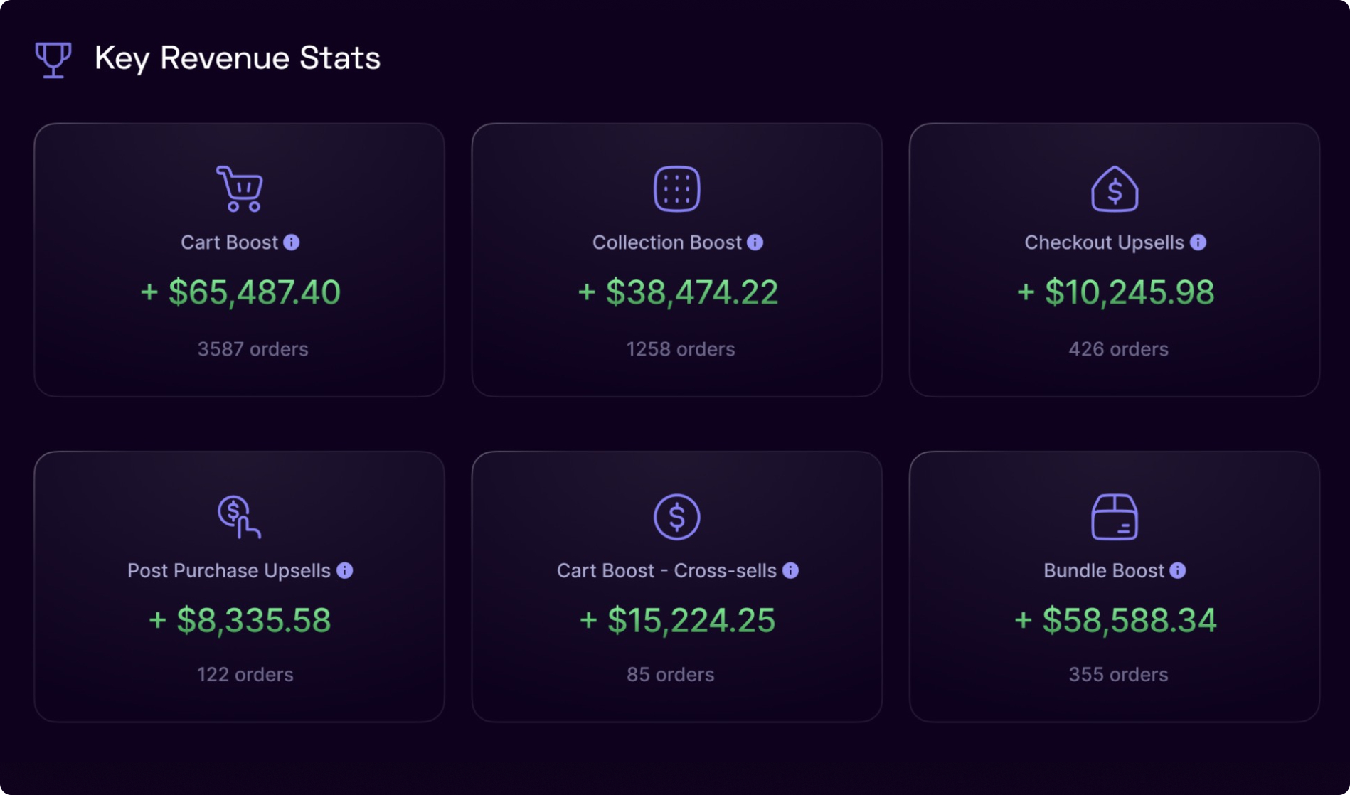 Boost includes Moneyboard, a comprehensive analytics dashboard that shows you exactly how much extra revenue Boost is generating for your store, broken down by feature.